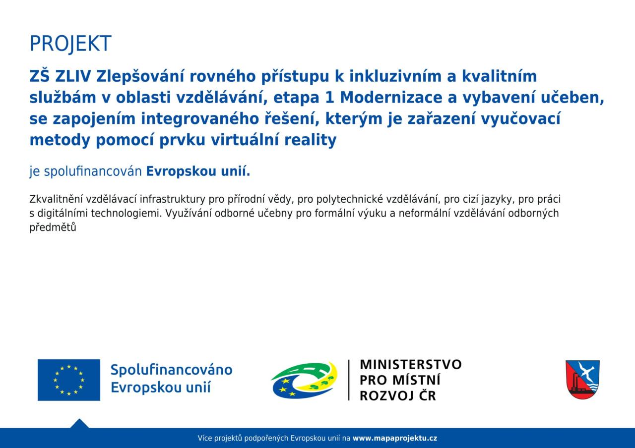 Předmětem projektu je modernizace a vybavení 11 odborných učeben základní školy zaměřených na přírodní vědy, polytechnické vzdělávání, cizí jazyky a práci s digitálními technologiemi. Nově upravené učebny budou sloužit pro výuku i zájmové a neformální vzdělávání a podpoří rozvoj klíčových kompetencí žáků.